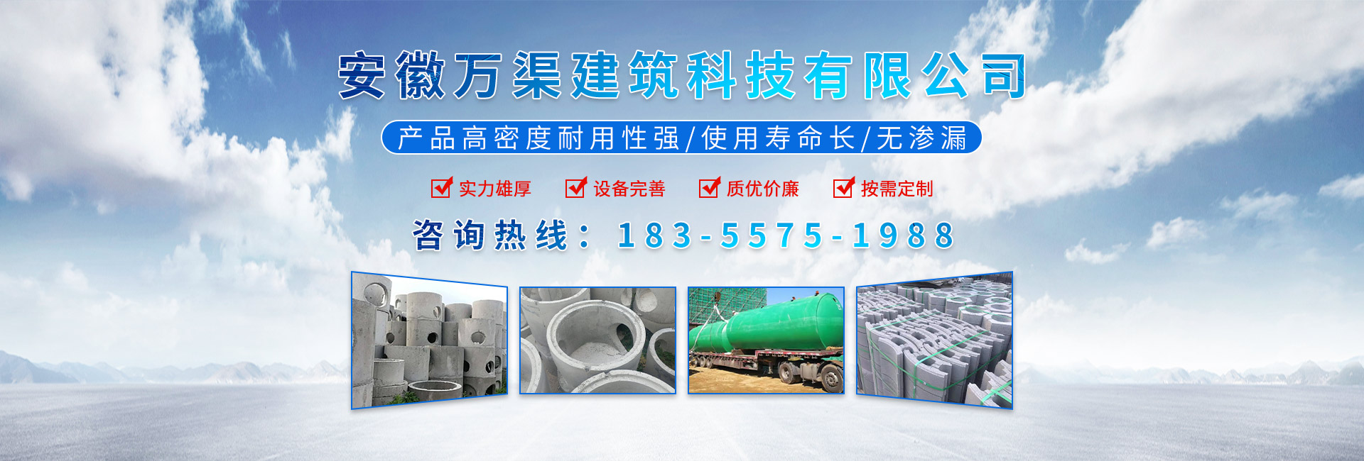 安徽萬渠建筑科技有限公司是集研發(fā),生產(chǎn)制造,市場推廣為一體的綜合性企業(yè)。公司主要經(jīng)營環(huán)保型預(yù)制鋼筋混凝土裝配式組合型檢查井和蓄水裝置等城建配套產(chǎn)品。產(chǎn)品生產(chǎn)過程采用獨特的生產(chǎn)工藝,機械化流水作業(yè)。產(chǎn)品大規(guī)模生產(chǎn),生產(chǎn)效率高,耗能少,成本低,產(chǎn)品使用壽命長、免維護、無滲漏、無污染,符合“綠色環(huán)保,低碳節(jié)能”的發(fā)展要求,是傳統(tǒng)磚砌井池的理想替代產(chǎn)品。